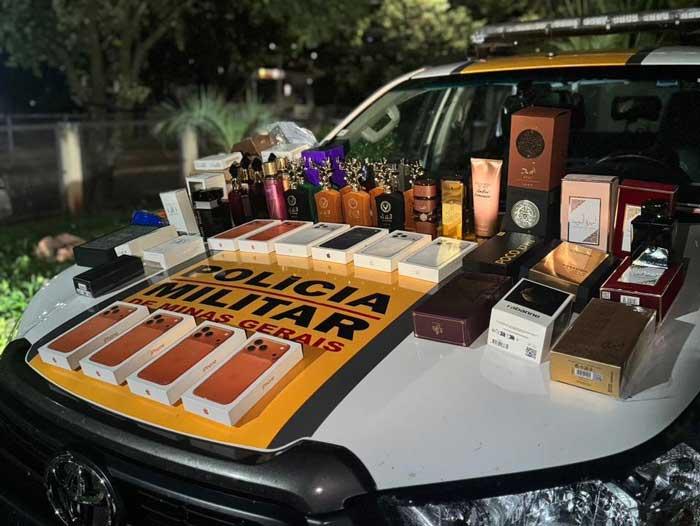 Durante a fiscalização, os militares abordaram um veículo Chevrolet Onix e localizaram diversos produtos de procedência estrangeira sem comprovação regular de importação. Entre os itens apreendidos estavam aparelhos celulares ocultados no interior de embalagens lacradas de perfumes, o que evidenciou tentativa de burlar a fiscalização.
