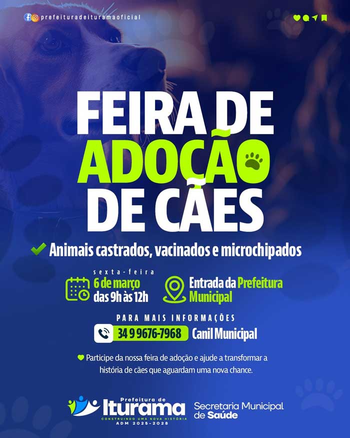 A Iturama recebe nesta sexta-feira, 6 de março, a Feira de Adoção de Cães, promovida pela Prefeitura Municipal de Iturama, por meio da Secretaria Municipal de Saúde.