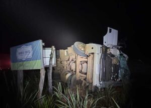 Segundo as informações apuradas, a carreta seguia pela rodovia no sentido crescente, quando, ao passar por uma curva, o veículo tombou na contramão da pista, arrastando-se por alguns metros até parar fora da pista de rolamento.