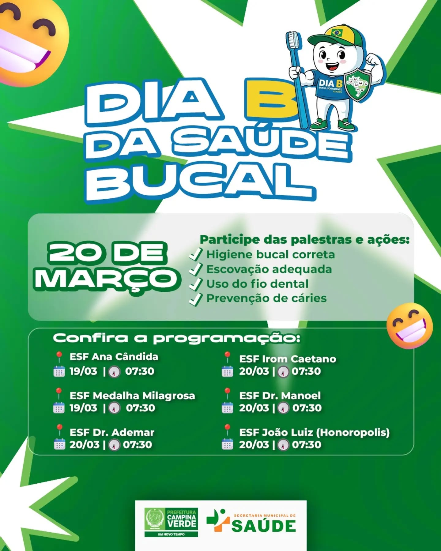 A Prefeitura de Campina Verde, por meio da Secretaria Municipal de Saúde, realizará uma programação especial em alusão ao Dia da Saúde Bucal, celebrado no dia 20 de março.