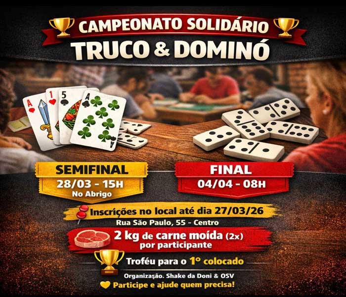 Um campeonato solidário de truco e dominó será realizado em Iturama com o objetivo de apoiar o Abrigo ao Idoso Sol Nascente, entidade que atende idosos em situação de vulnerabilidade.