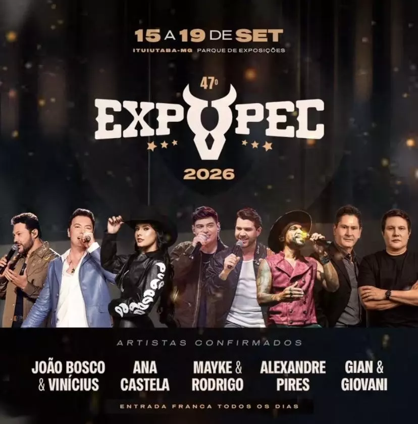A Prefeitura de Ituiutaba divulgou oficialmente as atrações musicais da Expopec 2026, uma das festas mais tradicionais do Triângulo Mineiro. O evento será realizado entre os dias 15 e 19 de setembro, no Parque de Exposições, em Ituiutaba, com entrada gratuita em todos os dias.