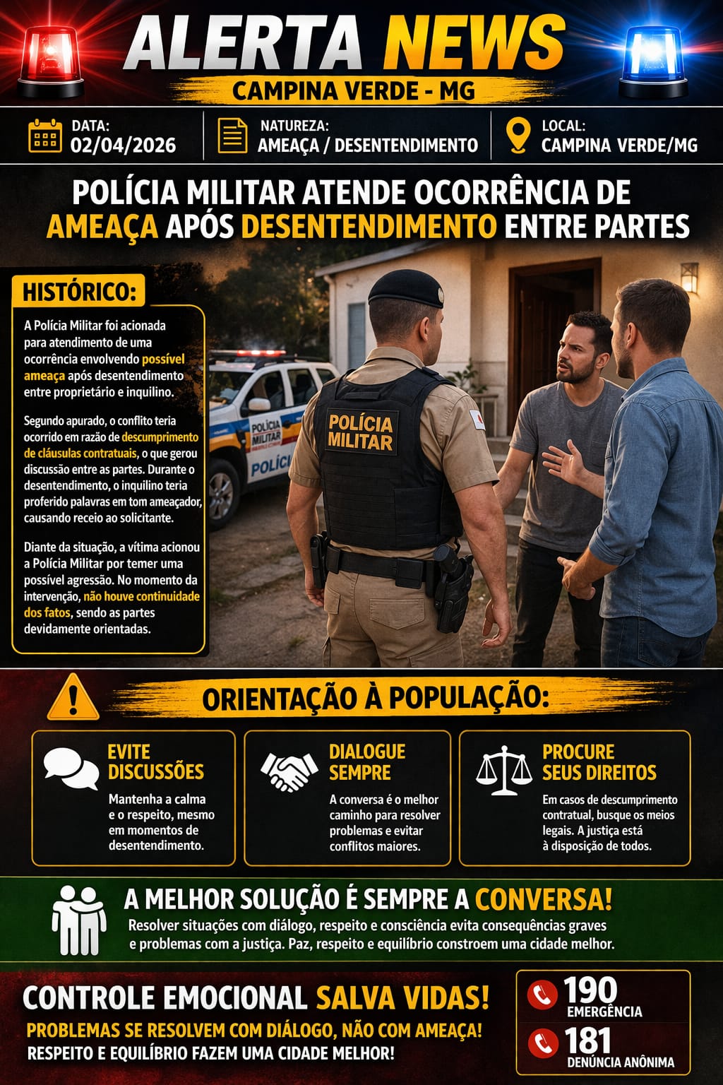A Polícia Militar reforça que conflitos fazem parte da convivência, mas devem ser resolvidos de forma pacífica e dentro dos meios legais.