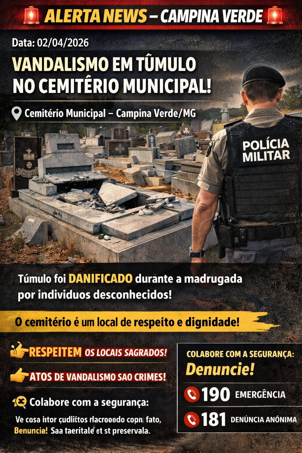 A Polícia Militar reforça a importância do respeito aos espaços públicos, especialmente locais como cemitérios, que representam memória, dignidade e homenagem às famílias.