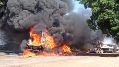 Frutal: Carreta bitrem pega fogo e causa nuvem de fumaça preta