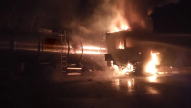 Frutal: Carreta-tanque bate em grade de proteção de ponte e pega fogo na BR-364